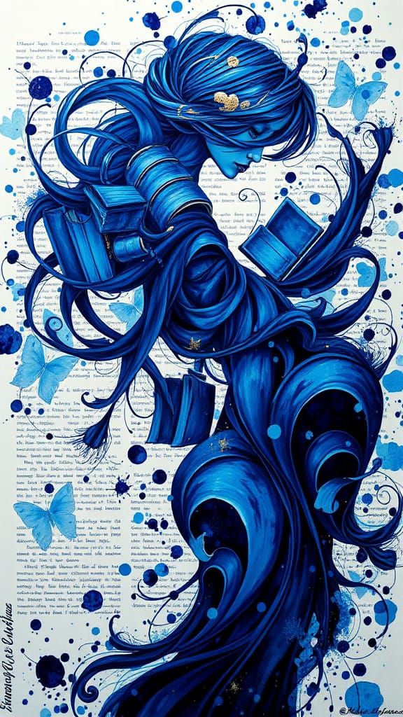This image features an abstract woman made of blue ink curves and book elements, presented as a vibrant, impressionistic oil painting with a dominant blue palette and gold leaf accents.