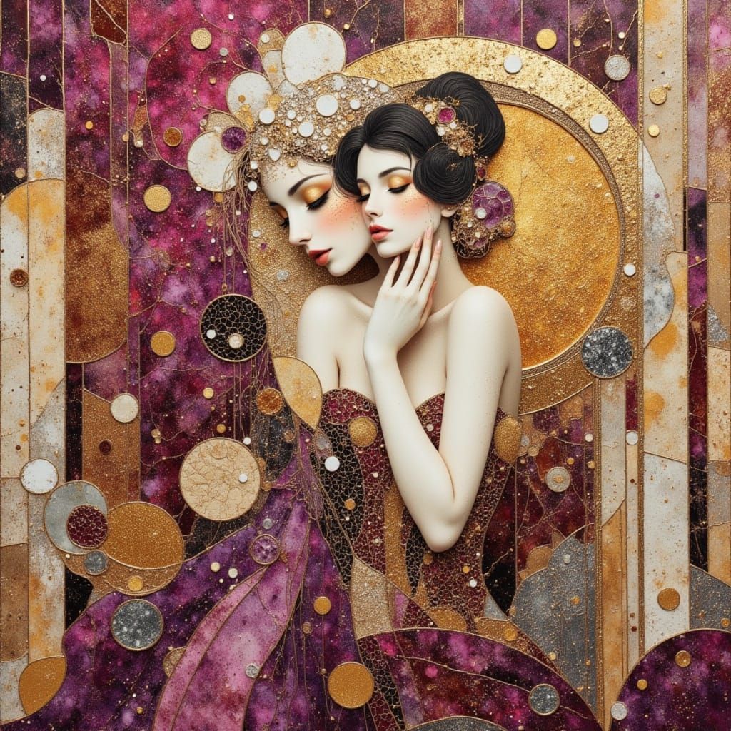 A mixed media collage of a woman in elegant attire, set against art deco architecture. The image features mosaic textures and splashes of magenta, gold, and silver ink, in the style of Klimt.