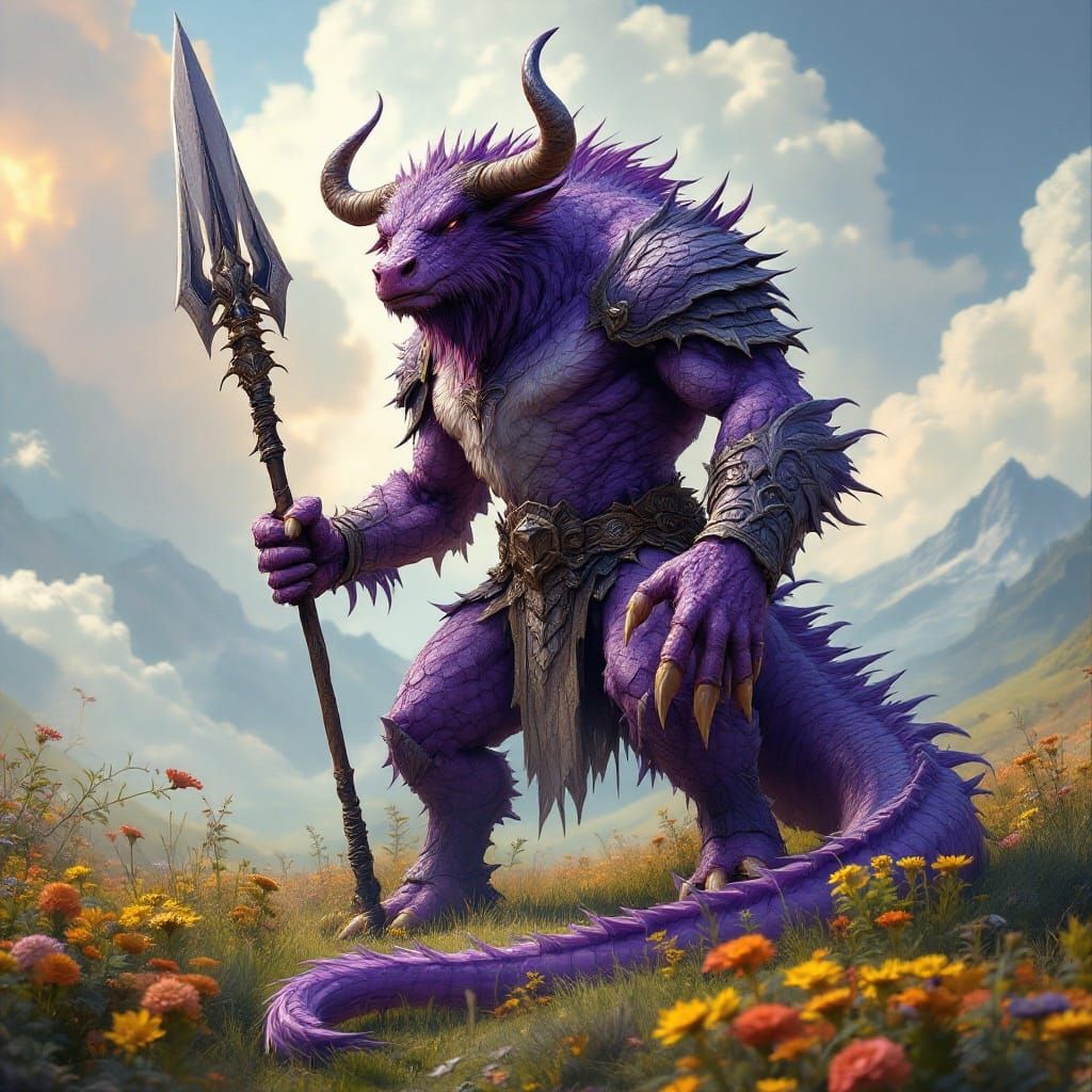 A powerful dragon bull hybrid stands proudly in a vibrant meadow, adorned in dragon scale armor and holding a large spear. The artwork showcases intricate details and textures, with dynamic lighting and complementary purple and yellow hues, reminiscent of classic fantasy art.