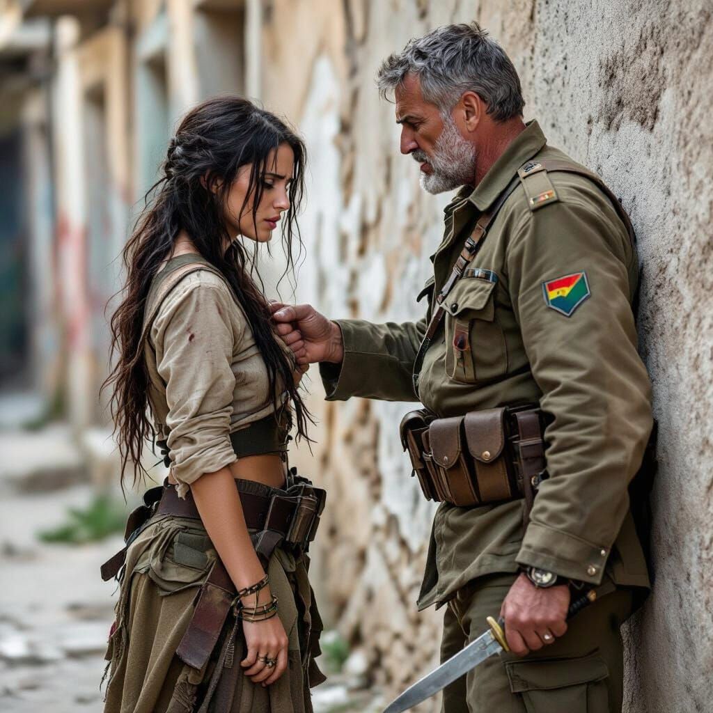 A hyperrealistic image of a distressed Spanish female guerrilla soldier. A towering male soldier is inches away, hand on her neck, knife to her chest. The scene is illuminated by sidelight in a vibrant, colorful background. Image is reminiscent of Simon Stalenhag.