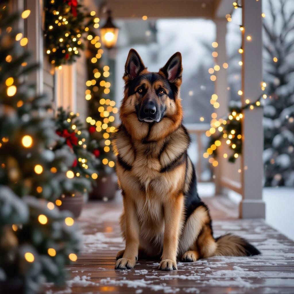 This image shows a photorealistic German Shepherd on a festive porch with Christmas lights and falling snow. The scene evokes a cozy, heartwarming holiday evening with cinematic lighting and a soft focus.