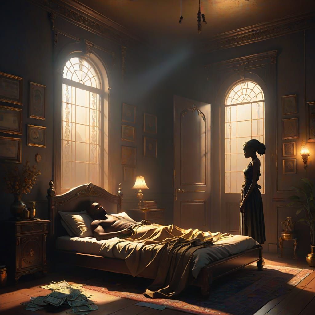 This image is a captivating 3D anime art piece with a dark fantasy theme, featuring a Haitian American character in a mystical scene with a woman and an air of intrigue. Warm golden lighting and deep shadows create a sense of depth and atmosphere, with intricate details and a soft ethereal glow.
