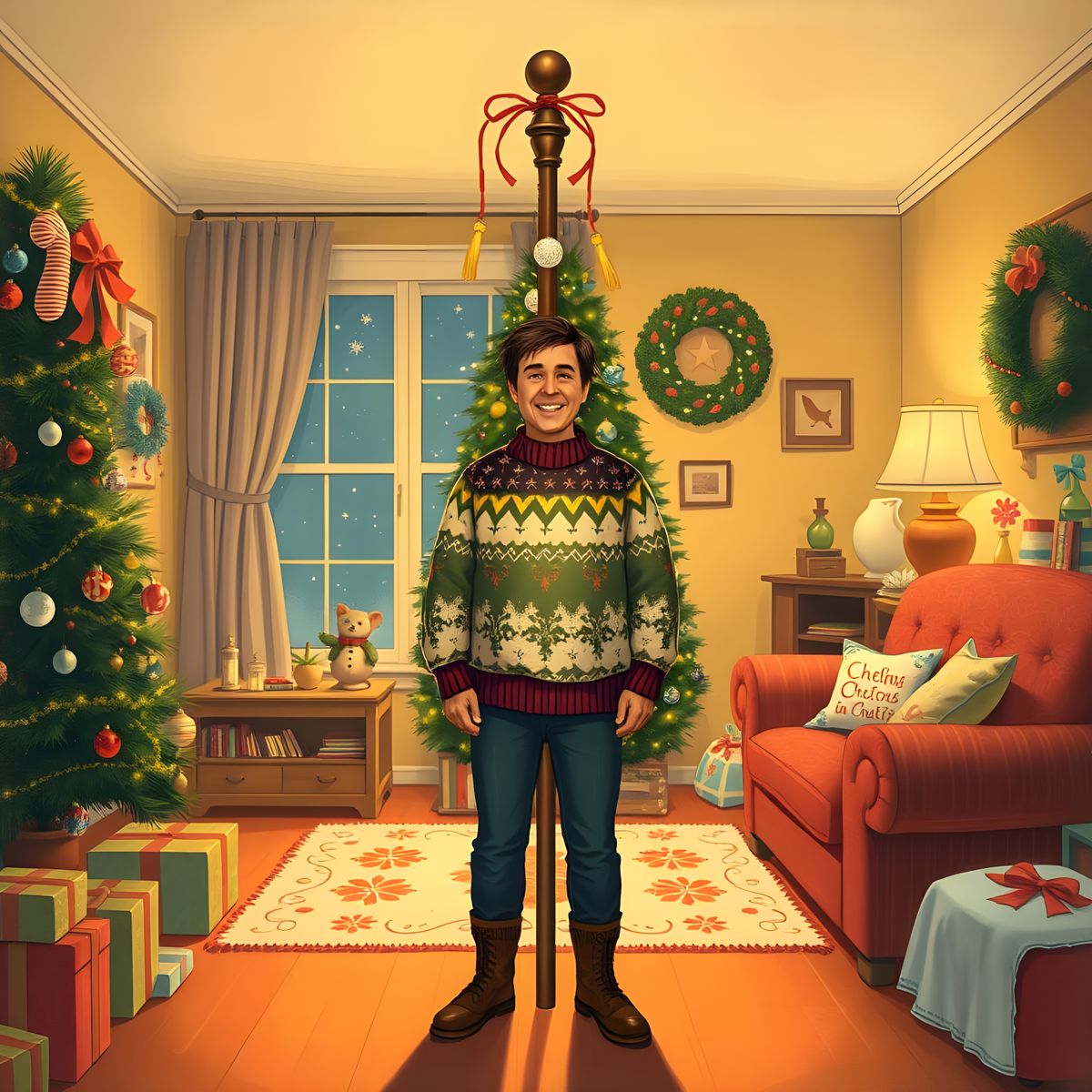 A cozy scene of a person celebrating Festivus in a warmly lit living room. Holiday decorations and a Festivus pole enhance the folk art style reminiscent of golden age illustration.