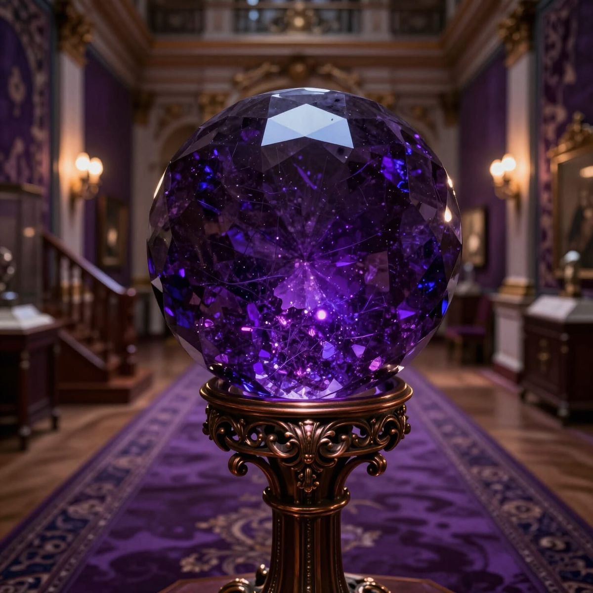 A striking image of a large, luminous, faceted amethyst gemstone on an ornate display stand within a dimly lit baroque museum. Dramatic lighting emphasizes deep purples and violets.