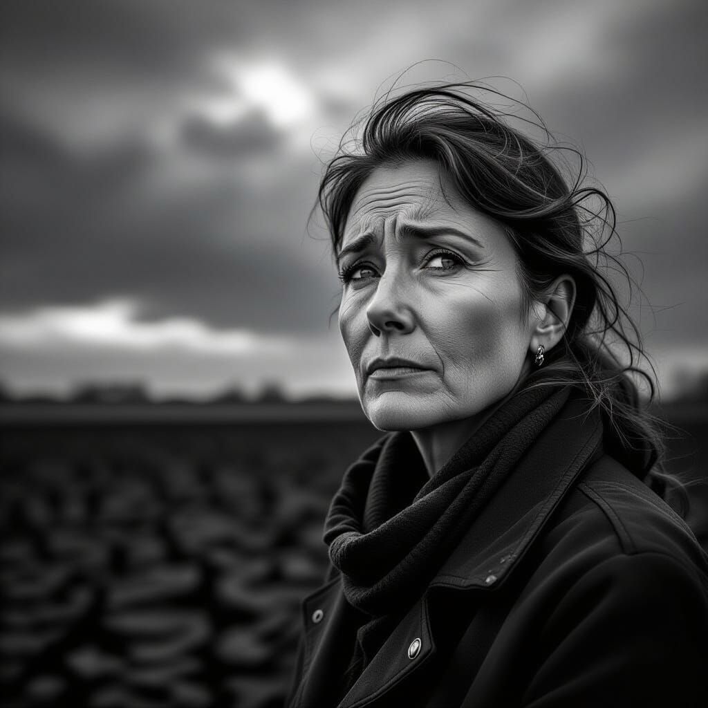 This high-contrast black and white photograph features a sad, mature woman against a backdrop of scorched earth and a stormy sky. Cinematic lighting enhances her emotional expression.