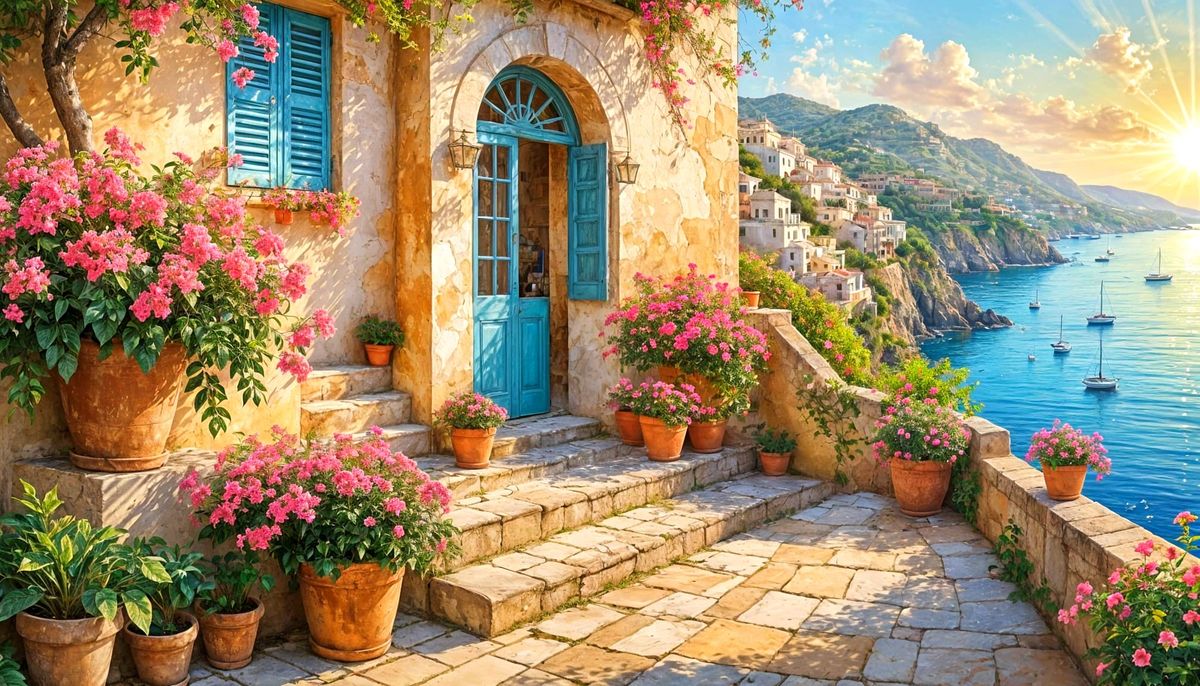 This image showcases a charming, sun-drenched terrace adorned with vibrant bougainvillea and lemon trees, offering a picturesque view of the sparkling blue sea in golden hour light. Created with a mix of watercolor and oil painting techniques.