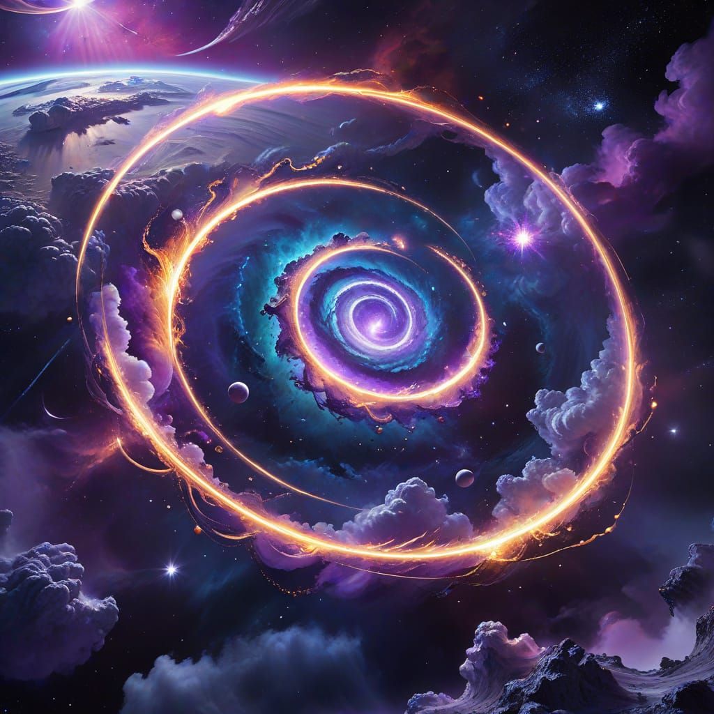 This image shows lonely planets in a cosmic landscape. An aerial view captures swirling purple gas and glowing rings, with stars twinkling. The artwork is a vibrant, detailed digital illustration.