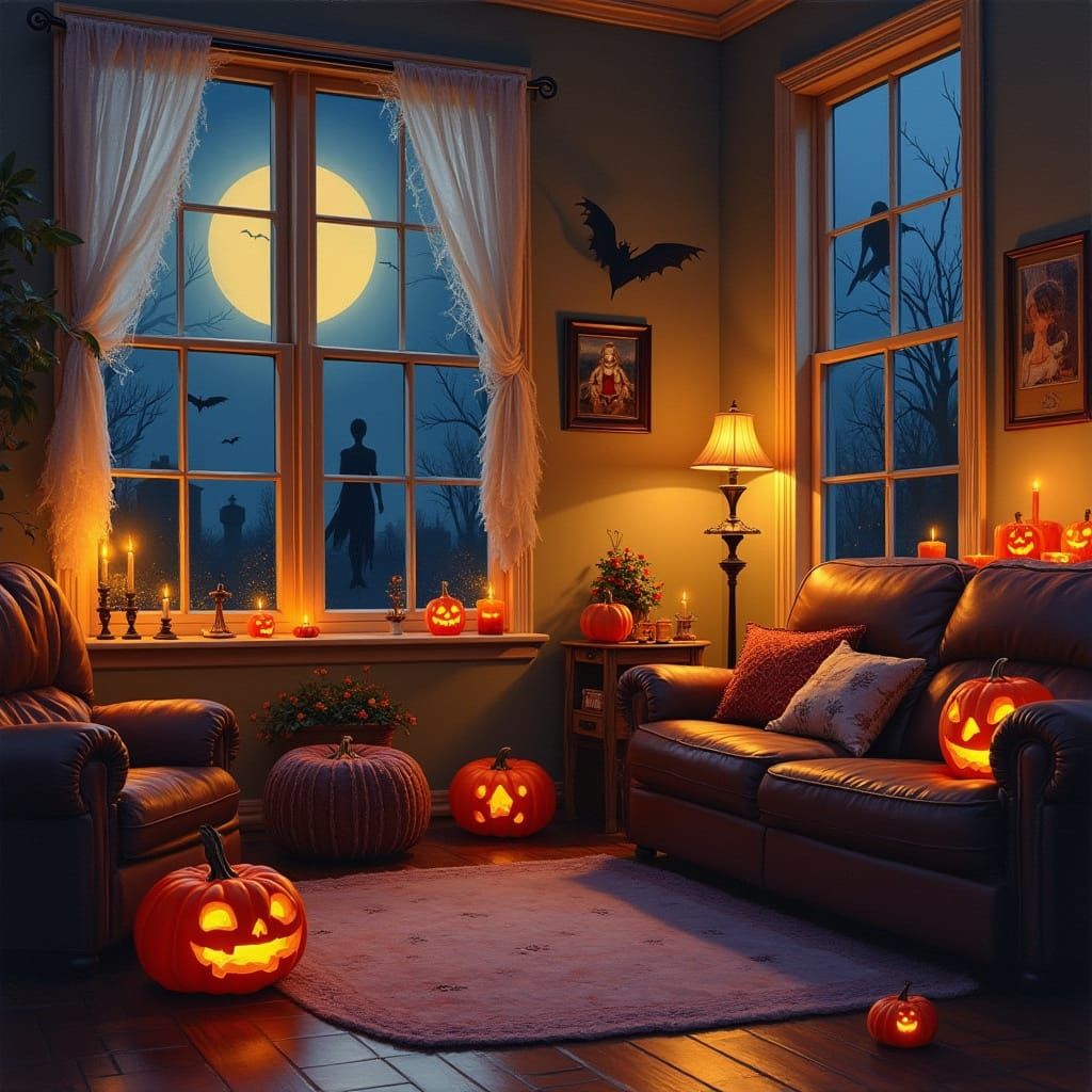 This image depicts a cozy living room decorated for Halloween, featuring jack-o'-lanterns, candles, cobwebs, and spooky window silhouettes. Rendered in a detailed oil painting style with atmospheric lighting.