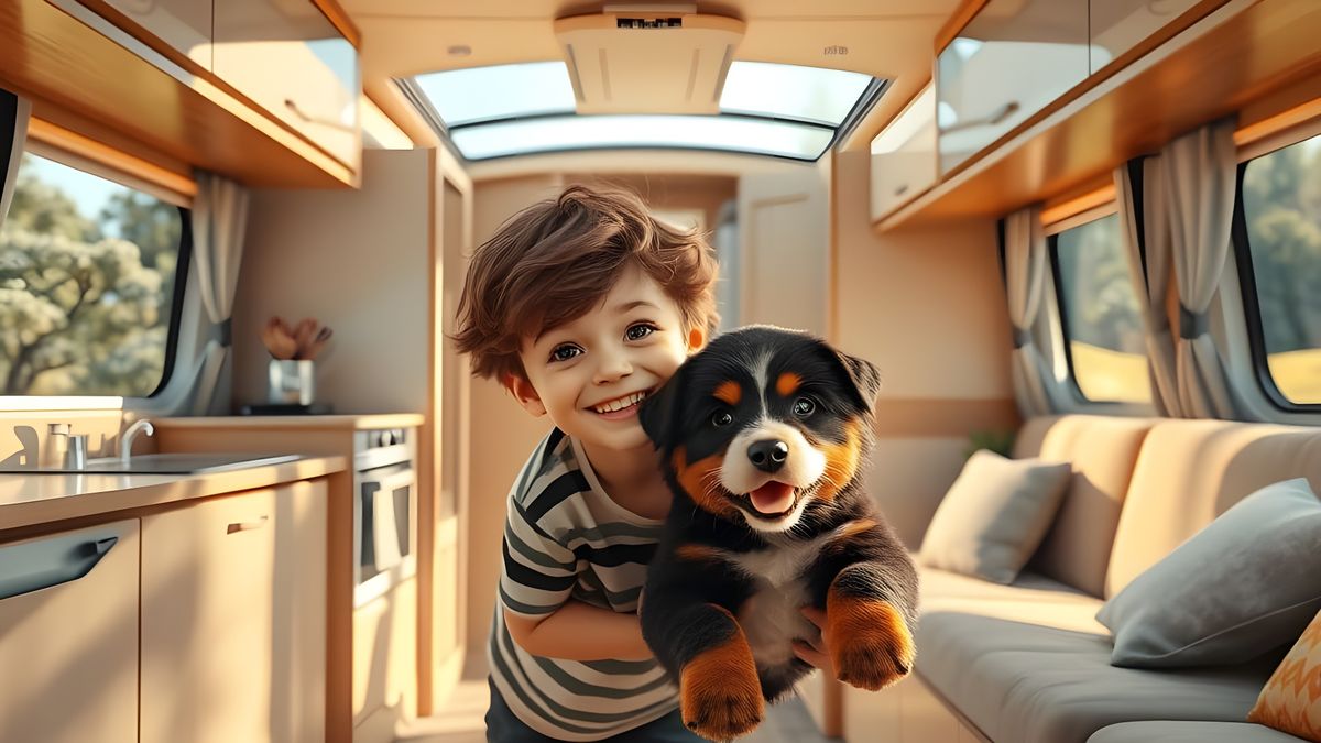 A vibrant image of a motorhome interior bathed in warm sunlight, featuring a happy 8-year-old boy and a playful Bernese Mountain Dog puppy, amidst a cozy kitchen, compact shower, plush sofa, and inviting bed, with Unreal Engine shading and Artstation-inspired digital art.