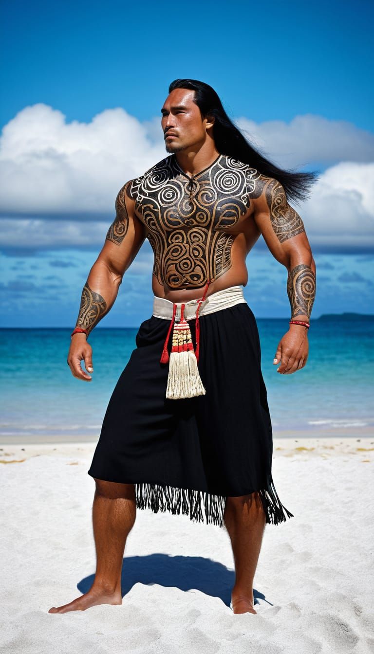 A digital image showing a muscular Maori man with long dark hair on a tropical beach. He wears traditional Maori clothing in this idealized portrait.