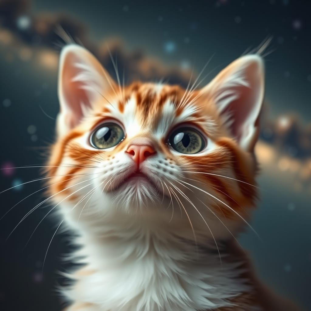 This image shows an adorable, big-eyed chibi cat gazing at the Milky Way. The close-up highlights its soft, fluffy fur and the extreme detail in the galaxy.