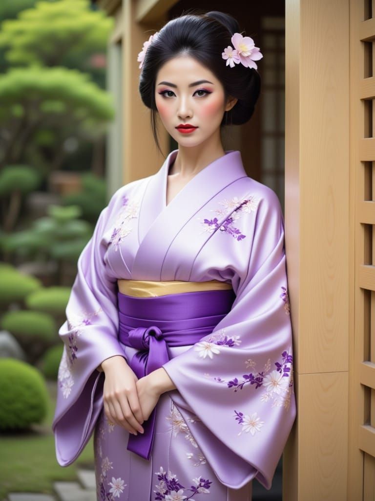 A full-body view of a young woman, in a traditional Japanese graduation kimono. It is lilac with embroidered floral patterns, mostly light purple, pink, and white blossoms/vines. The kimono features a deep, rich purple skirt with intricate floral embroidery, with small embroidered bows and flowers. ...