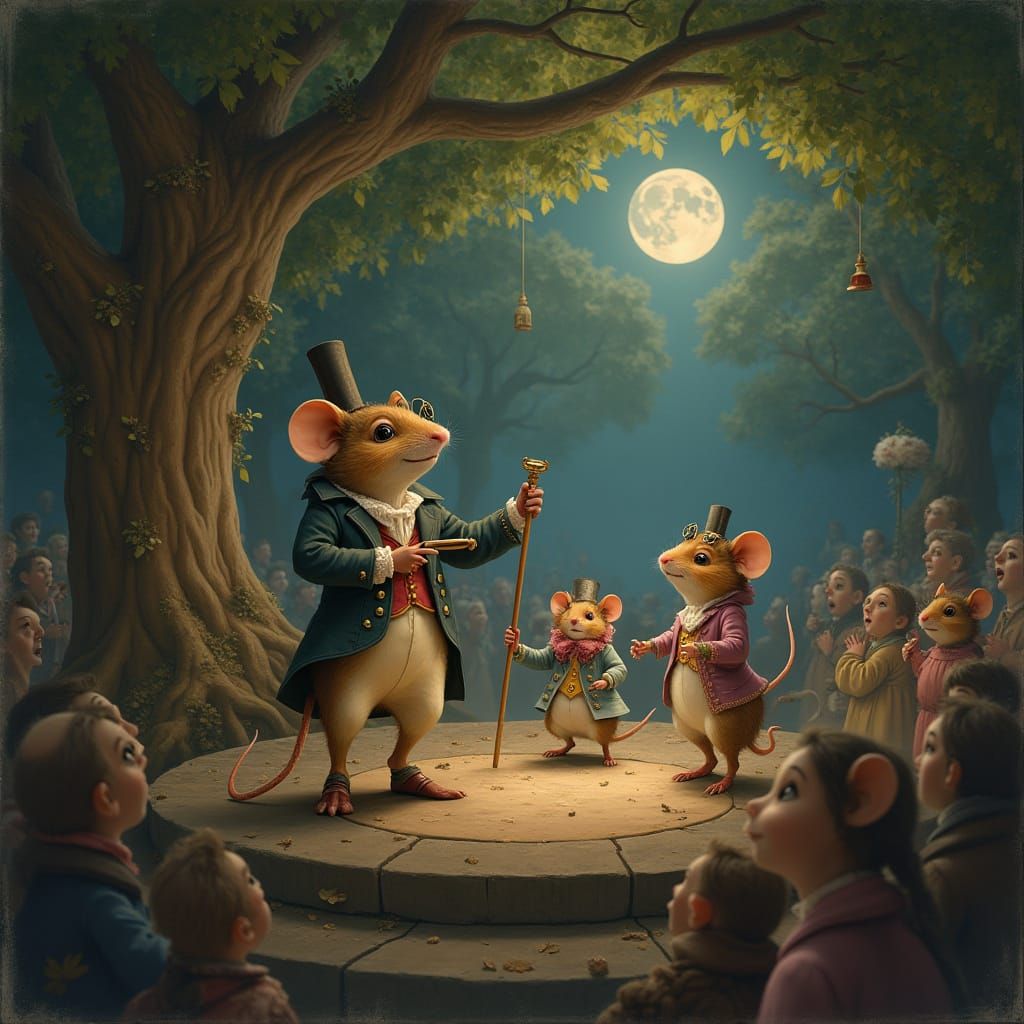 This image shows a charming mouse circus within the roots of a tree. Victorian-dressed mice perform for an audience, rendered with hyper-realistic detail in a whimsical style.