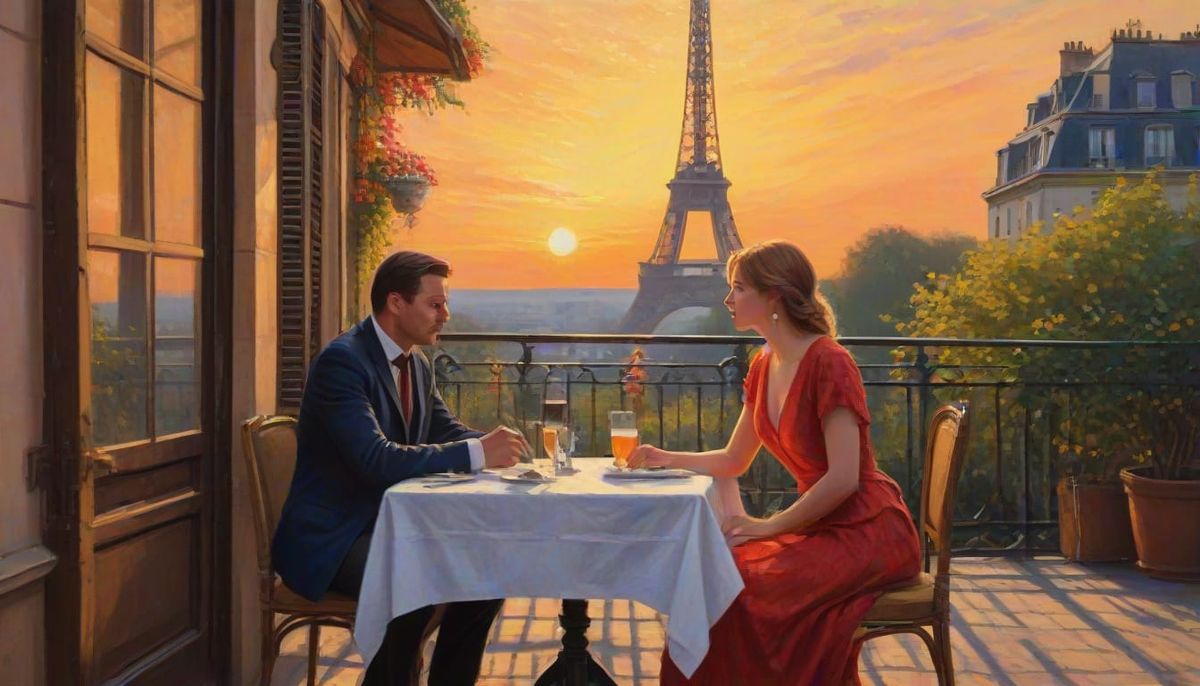 A vibrant neo-impressionist painting of a stylish couple dining on a Paris terrace, with the Eiffel Tower visible in the distance. The artwork employs impasto techniques with thick, colourful brushstrokes.