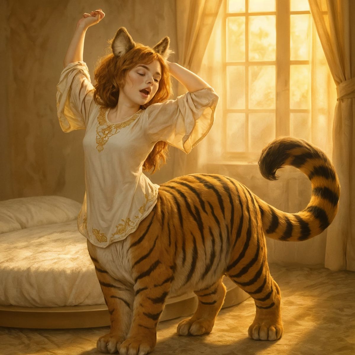 This image shows a centaur with a female upper body and the lower body of a tiger, yawning and stretching. She has tiger ears and is wearing a tunic with golden embroidery.