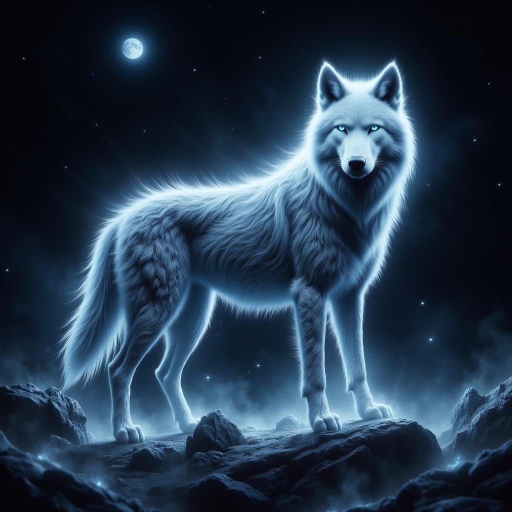 A luminous wolf shines in the darkness, surrounded by a smooth, glistening clear night sky with shades of white, grey, and silver.