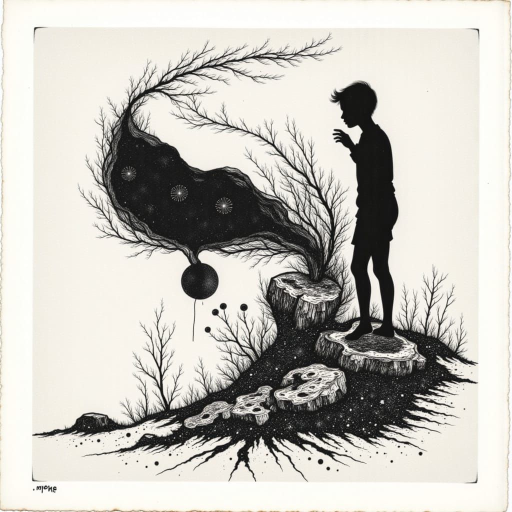 <lora:Lin-Op Cut:1.0> Linocut-style minimalist line art, negative space portrait, single line figure, absence and identity; Large areas of negative space suggest absence, loss, and silence. Despite reduction, the figure feels intact. Trauma is implied through what is missing rather than what is shown. ...