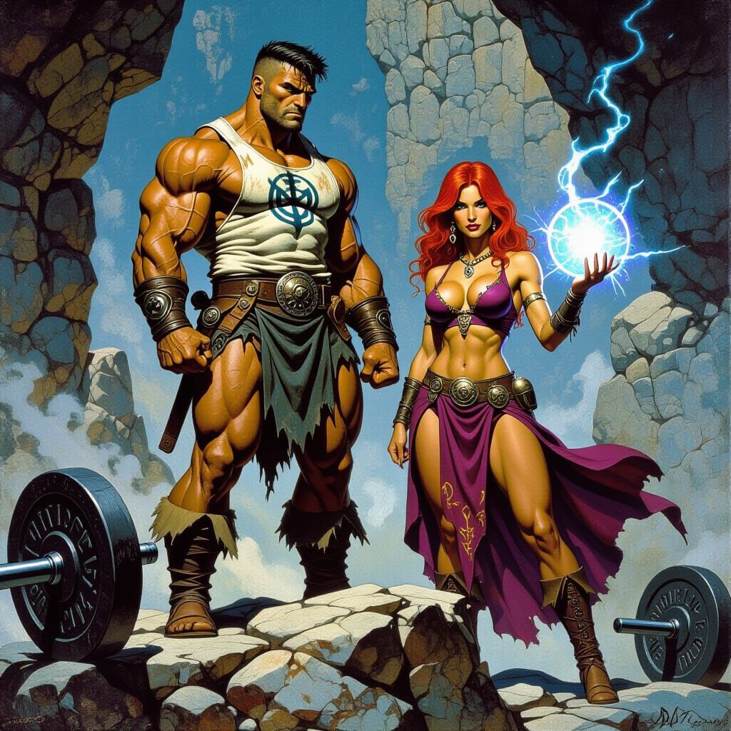 This image shows a muscular warrior in a tattered tank top standing next to a sorceress channeling arcane energy. The scene is set in a mystical gym with ancient runes, rendered in a bold, dramatic fantasy art style.
