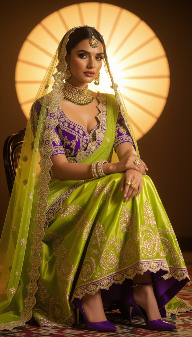 This image shows a beautiful Indian woman wearing a traditional dupatta and mangtika, with a modern lime green and purple leather outfit. The image features realistic skin textures and dramatic studio lighting, in a hyper-realistic style.