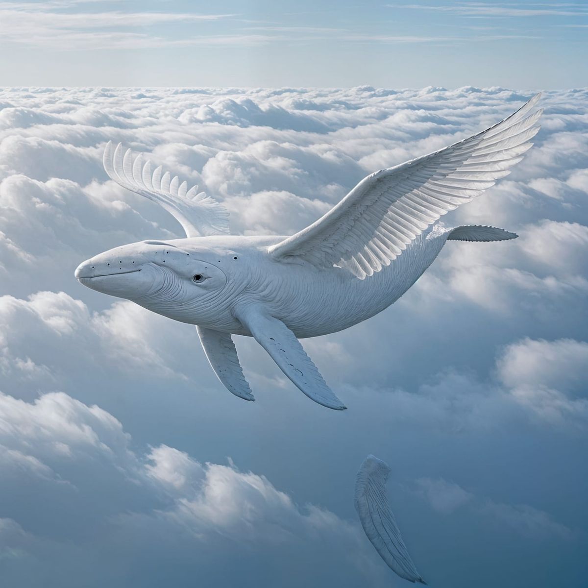 A colossal white whale with wings, gliding through clouds of pure white. Feathers and skin textured with faint silver patterns. Dreamlike, minimalist surrealism.