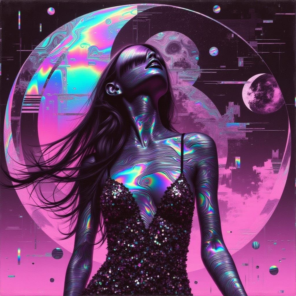 A retro-futuristic image of a female fashion model with iridescent zebra skin and long hair, wearing a sequin dress. The aesthetic blends 1980s style with chrome and neon circuitry.