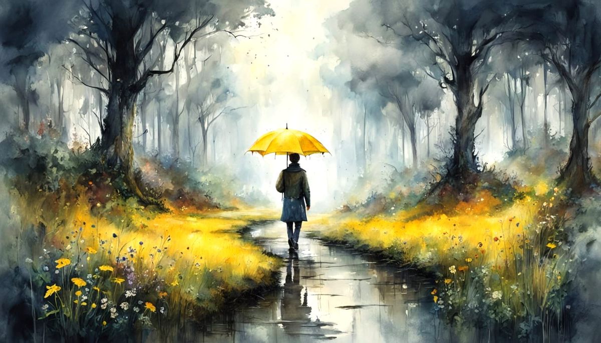 A lone figure with a yellow umbrella walks through a rainy forest as mist rises. This image shows a watercolor painting with intricate details, capturing a moody and atmospheric scene.