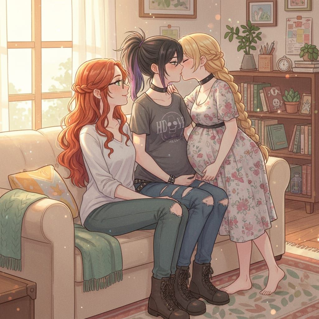 A soft, cute anime illustration of a woman with red hair watching her two pregnant wives share an intimate moment. The scene is illuminated by warm, gentle light.