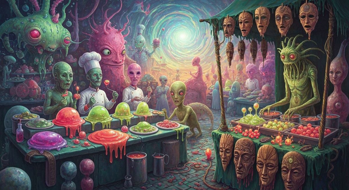 This image shows a bustling intergalactic food court filled with bizarre alien chefs and patrons enjoying exotic dishes. The scene blends surrealism and fantasy art with hyper-detailed textures and vibrant colors.