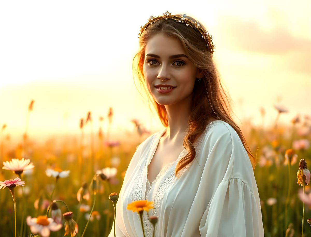 This serene woman stands in a lush meadow, surrounded by vibrant wildflowers that symbolize the fleeting nature of human life. The warm, golden atmosphere and soft clouds evoke a sense of gentle reverence, while the subtle light in the background represents the enduring word of God.