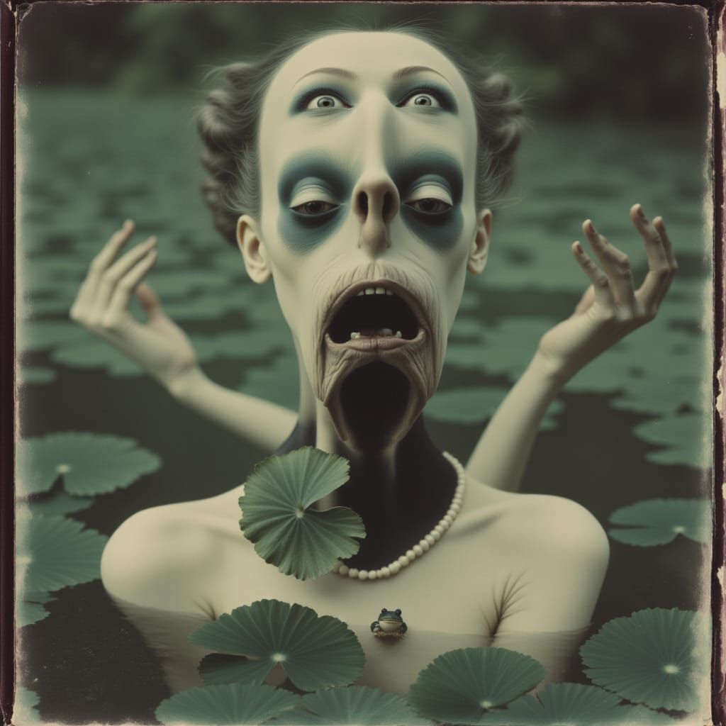 This image shows a pale princess with wide eyes holding a lily pad with a tiny frog, set against a dark tunnel. It evokes a melancholic mood with muted colors and soft focus, reminiscent of early photographic techniques.