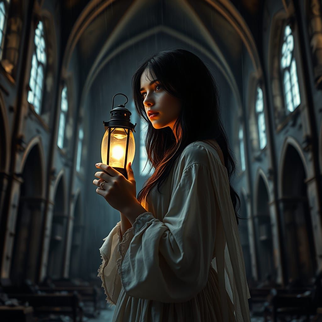 This haunting portrait of a girl in a tattered white dress gazes into the ruins of an apocalyptic cathedral, surrounded by ominous shadows and a warm, golden light, evoking a sense of foreboding and mystery.