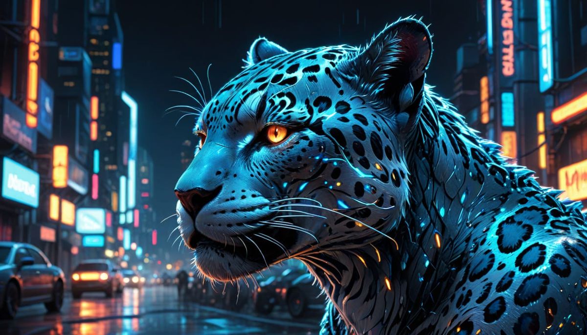 This image shows a cyberpunk jaguar cyborg standing in a neon-lit city. The animal-machine hybrid features glowing blue circuits, metallic fur, and vibrant reflections in a comic book aesthetic.