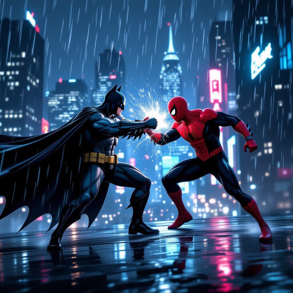 This image depicts Batman and Spiderman in a high-octane martial arts battle on a rainy skyscraper at night. Cinematic lighting and a dark palette create a dramatic, hyperrealistic scene.