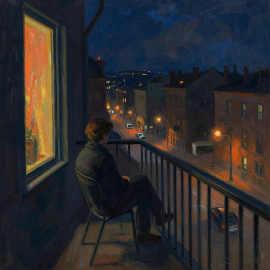This image shows a lone person on a balcony gazing at a tranquil city at night. Rendered with soft brushstrokes and a deep blue and orange palette, it captures a serene mood of quiet thought.