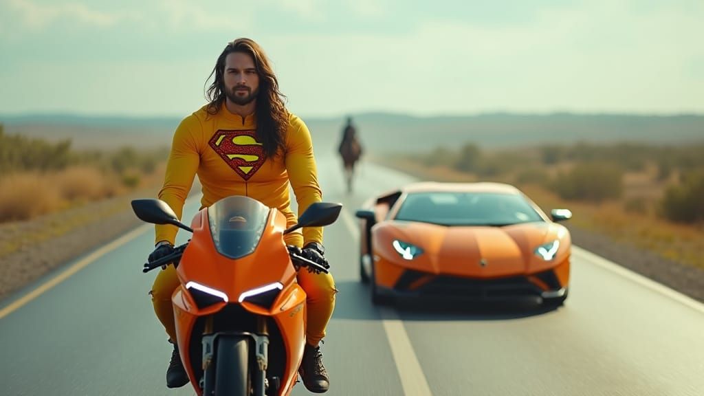 A stunning hyperrealistic image of a man in a yellow suit, riding an orange superbike alongside a Lamborghini, with a horse galloping on a watery highway, captured in a cinematic style with shallow depth of field and warm natural lighting, reminiscent of fine art photography
