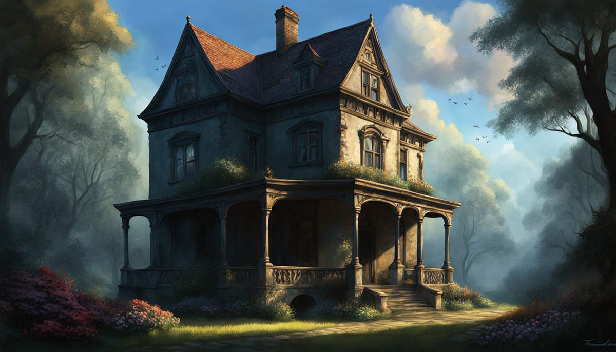 A digital illustration of a stone head adorned with many flowers, veiled in gothic art nouveau style. Volumetric lighting and triadic colors enhance the ominous, mysterious atmosphere.