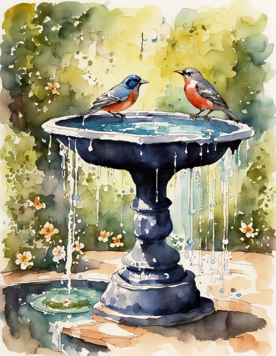 This image shows a beautiful watercolor ink depiction of a serene old ceramic bird bath and fountain, with birds happily bathing in the tranquil atmosphere.