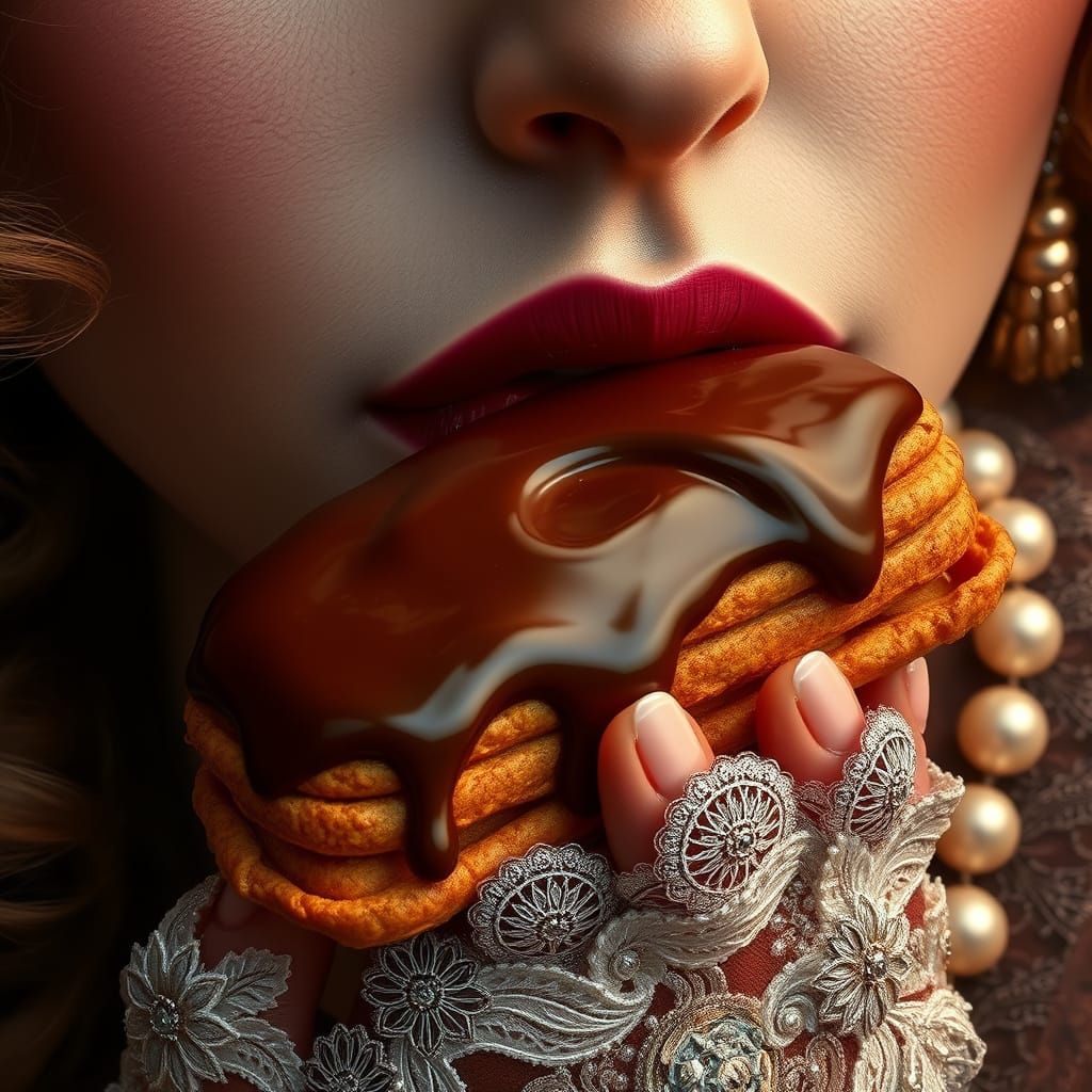 A visually striking image of a churro dipped in chocolate, held by a woman's lips. The scene features baroque-style attire, rich colors and swirling patterns in a matte painting style.