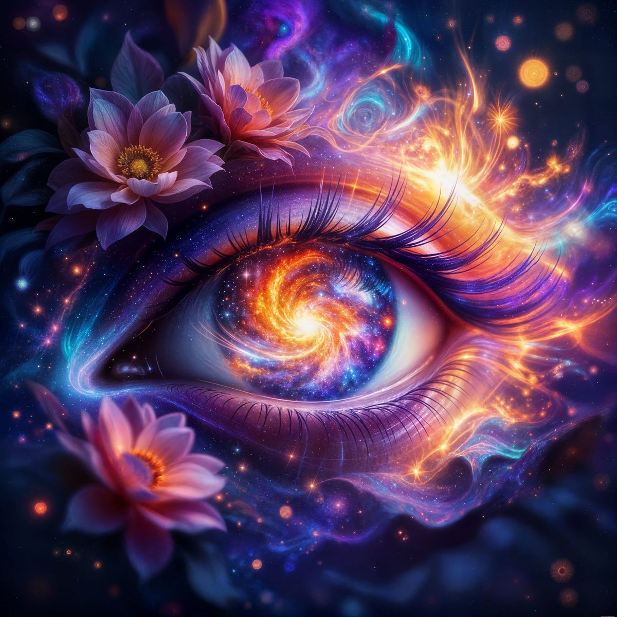 This image displays a hyper-detailed, ultra-realistic cosmic goddess eye transforming into a vibrant nebula of flowers and galactic textures. Features swirling stardust, auroras, and solar flares.