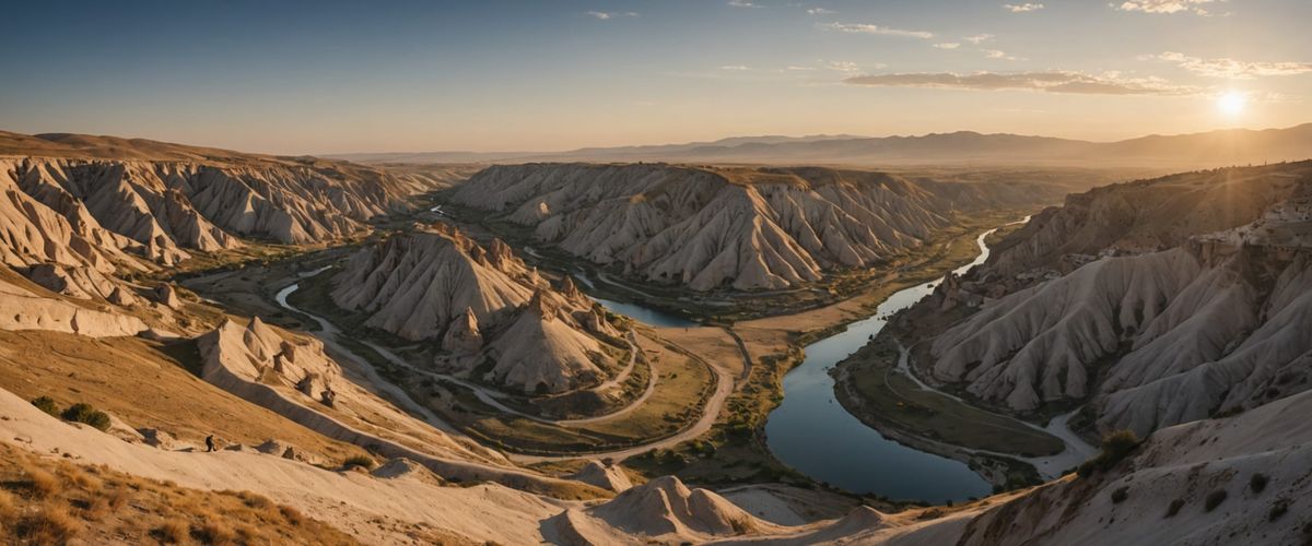 Uma foto incrivelmente serena de um rio serpenteando por um vale pitoresco, Uma foto com qualidade cinematográfica de uma cena surreal na Capadócia, ...