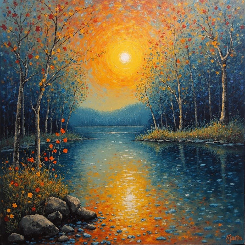 This image shows a woman in a flower-patterned dress, surrounded by colorful flowers and spots. The aesthetic is reminiscent of impressionist masters, painted with a vibrant, textured style.