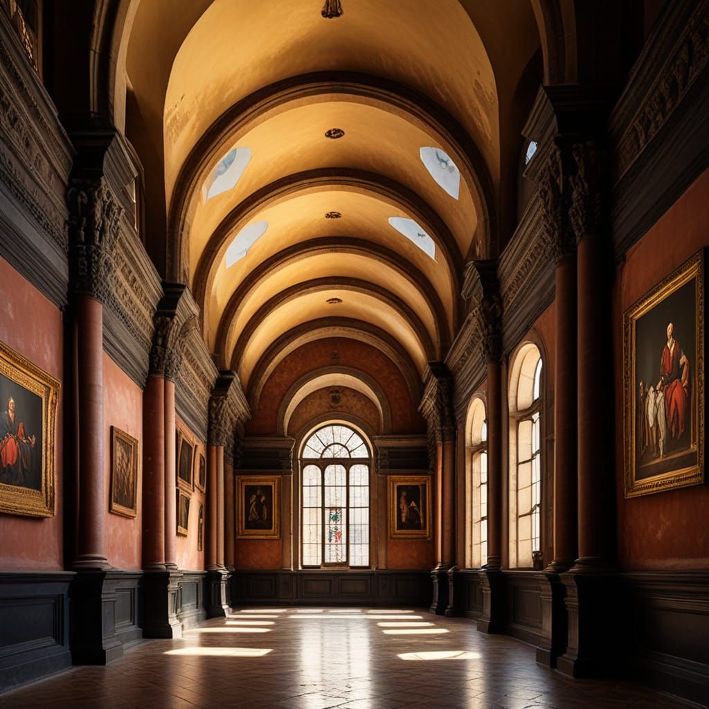 This image shows museum-goers admiring exhibits in the stunning grand hall of Kromberk Castle, surrounded by Italian Renaissance architecture and warm natural light