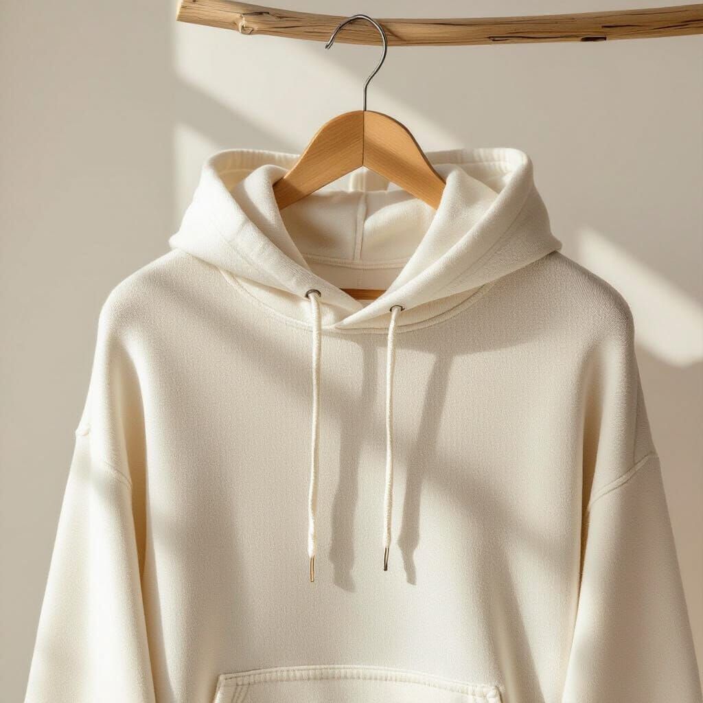 This image showcases a plain, off-white hoodie with a light beige hood, elegantly displayed on a wooden hanger. Captured in soft daylight, it highlights a chic, feminine aesthetic with a focus on texture and drape.