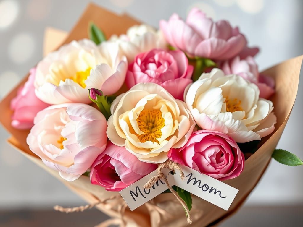 This charming image features a delicate bouquet of peonies and roses in soft pastel hues, wrapped in textured kraft paper and tied with a handmade 'Mom' tag. Dewdrops glisten on the petals against a soft, dreamy background, evoking a fresh and whimsical aesthetic.