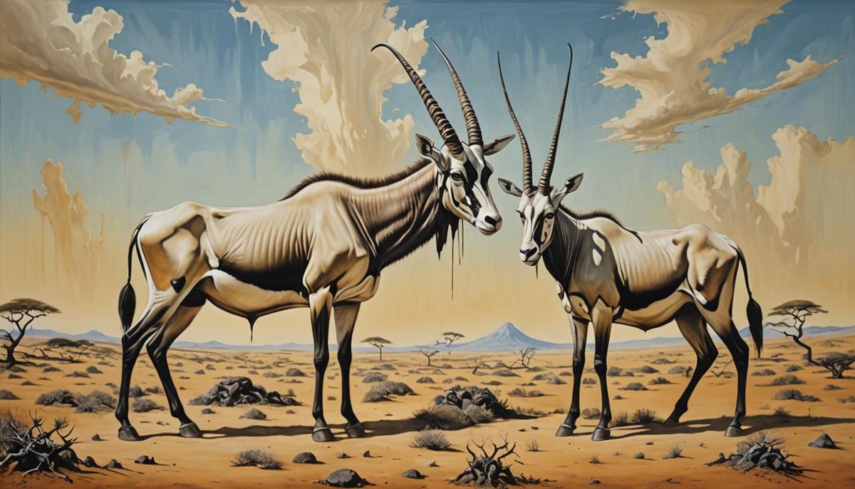 A surreal oil painting of an Oryx in the Serengeti. The artwork evokes a dreamlike quality with melting elements and a matte backdrop, reminiscent of surrealist paintings.
