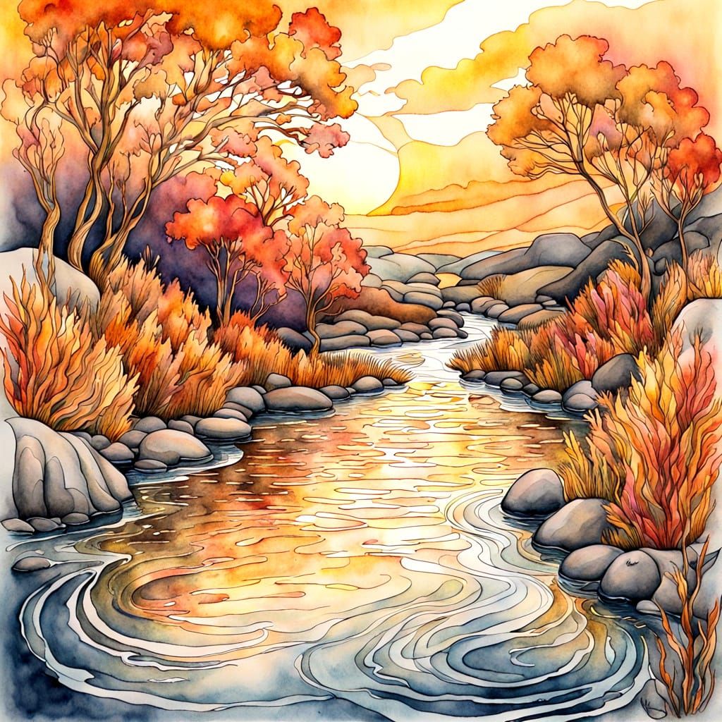 This image features a serene watercolor and pen illustration of a sunset over a winding river, with vibrant autumn colors and soft brushstrokes.