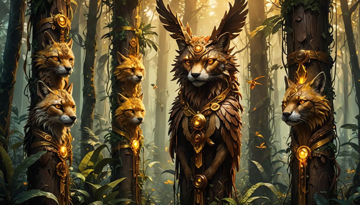 This image shows intricately detailed totem poles in a lush jungle setting, featuring hyper-realistic animal heads that transform into glowing, ghostly ribbons of smoke. Rendered in a cinematic style with warm, brown-ochre tones and a sense of dramatic, atmospheric depth.