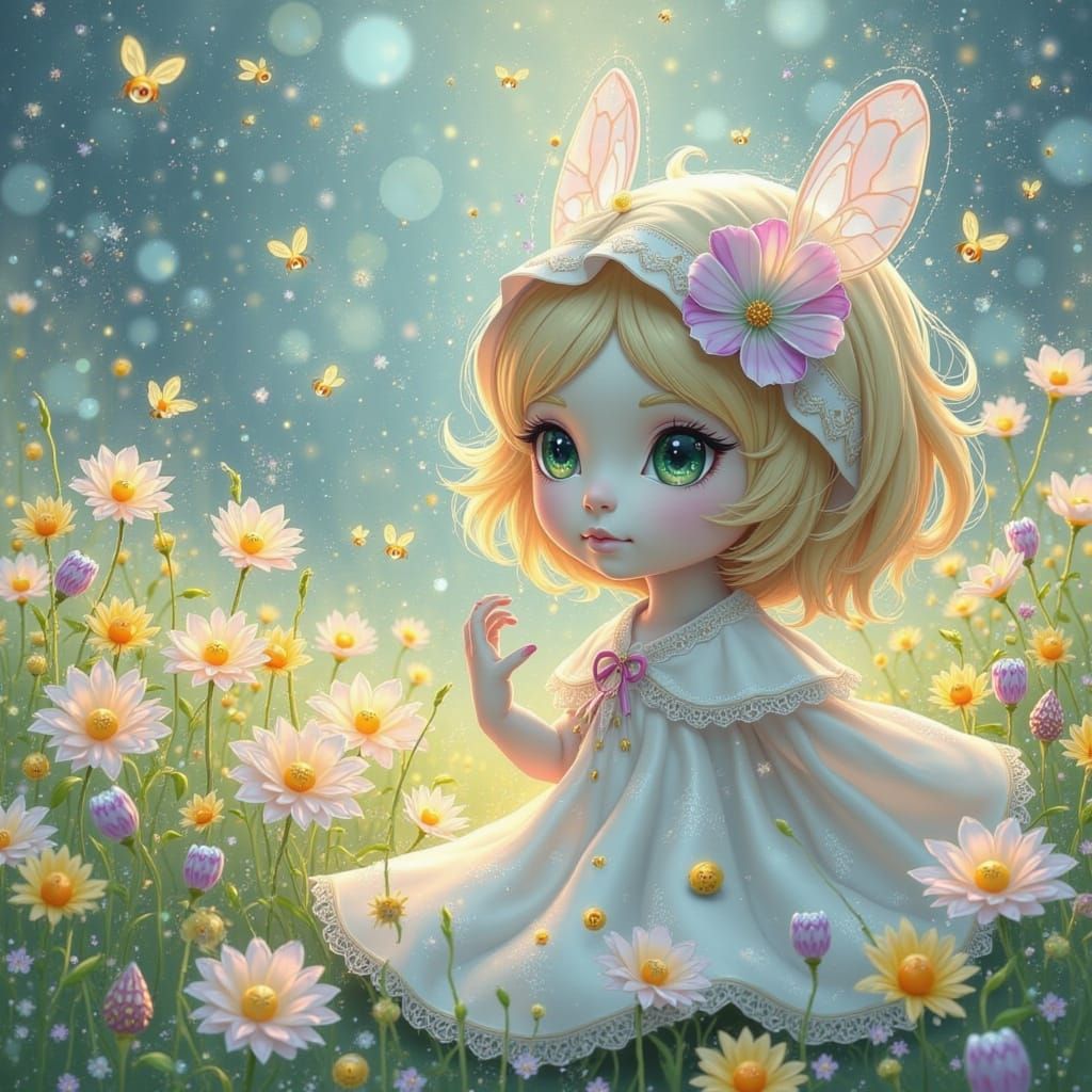 A charming image of a child in a magical meadow filled with pastel flowers and fireflies. The artwork evokes Beatrix Potter's illustrations with a soft, watercolor aesthetic.