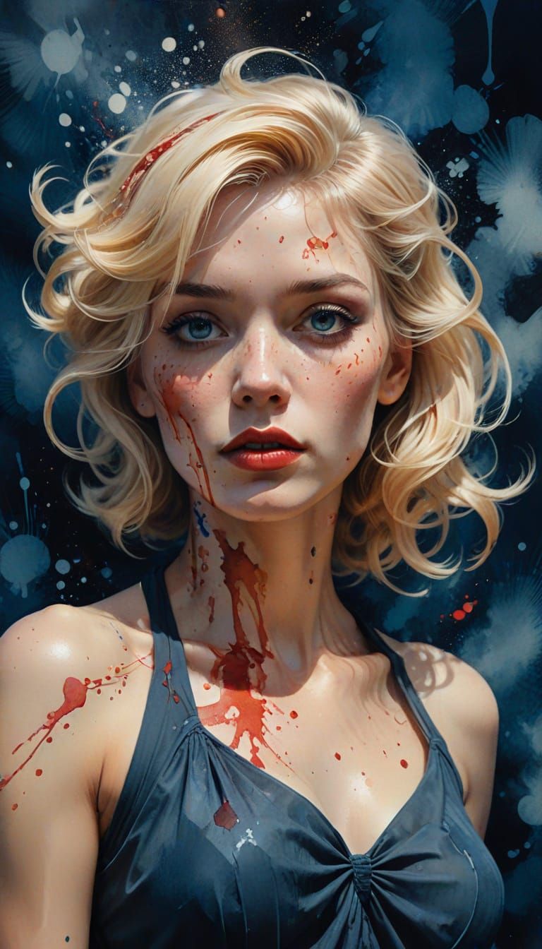 A striking image of a 1950s pin-up girl with direct eye contact. The portrait blends watercolor and ink techniques with smoky gradients and dynamic lighting to create a surreal aesthetic.