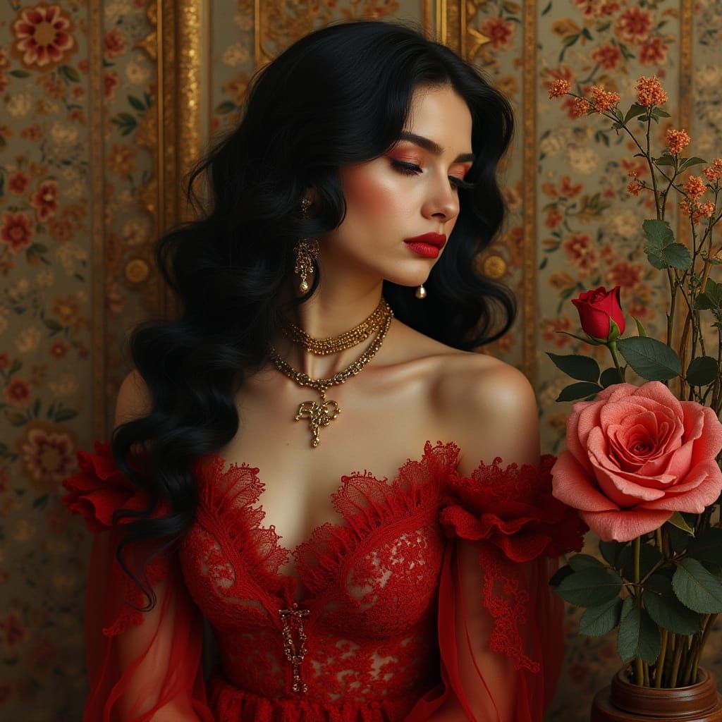 Uma mulher turca de beleza exótica veste um vestido vermelho rubi coberto de lantejoulas, cintilando como chamas sob um lustre ornamentado. Seus cabelos negros e longos caem suavemente sobre os ombros. Atrás dela, uma mesa de mármore exibe um pergaminho antigo com a inscrição ...